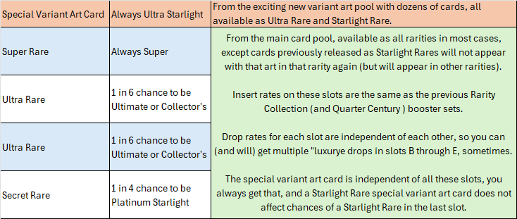In each 5-card pack, 4 slots pull from that main card pool, in a variety of rarities, from the normal Super, Ultra, and Secret Rares, to Starlight, Platinum Secret, and the unique “Prismatic”-style Ultimate & Collector’s Rares found only in Rarity Collection sets.